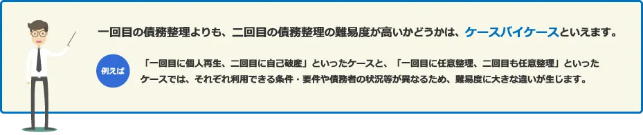 1回目の債務整理よりも、2回目の債務整理の難易度が高いかどうかは、ケースバイケースです。例えば、「1回目に個人再生、2回目に自己破産」といったケースと、「1回目に任意整理、2回目も任意整理」といったケースでは、それぞれ利用できる条件・要件や債務者の状況等が異なるため、難易度に大きな差が生じます。